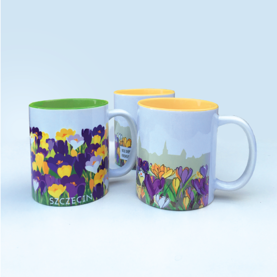 2 – żółte wnętrze kubka (krokusy + zarys szczecińskich zabytków + napis „Nie deptać krokusów”)